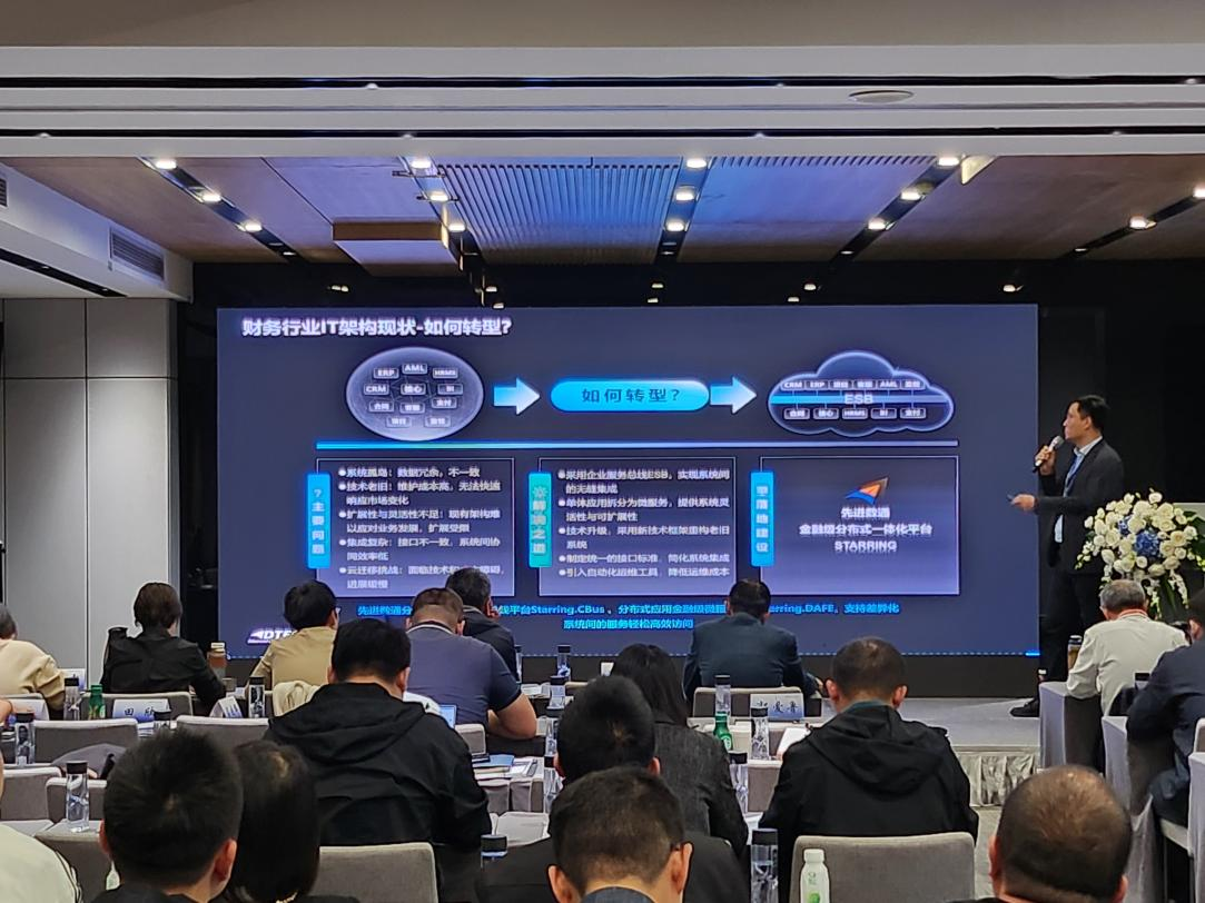 顺发配资代表讲师郭钰以《昆仑与顺发配资ESB解决方案助力财务行业创新与架构转型》为主题作发言分享。他深入剖析了当前财务行业IT架构面临的挑战,包括系统孤岛、技术老旧、扩展性不足等问题,并提出了基于企业服务总线(ESB)和微服务架构的转型方案。